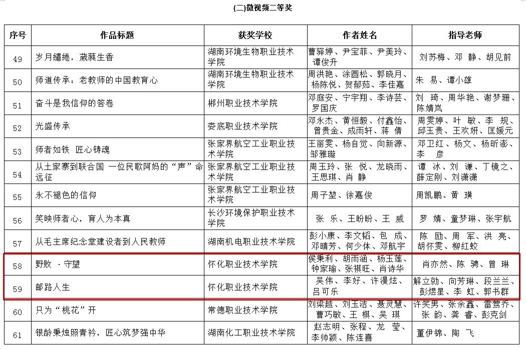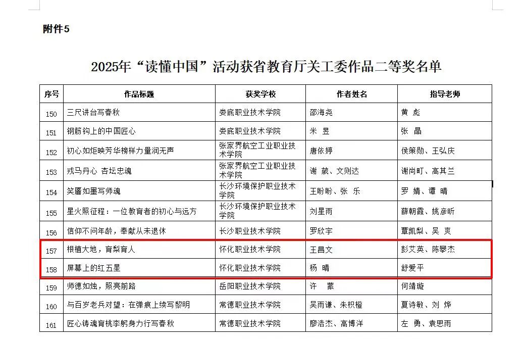 近日,中共湖南省委教育工委下发《关于公布2025年全省普通高校“读懂中国”主题教育活动优秀组织奖和作品奖评审结果的通知》,我校选送的征文作品《根植大地,育梨育人》和《屏幕上的红五星》荣获二等奖,微视频作品《野败·守望》和《邮路人生》荣获二等奖。